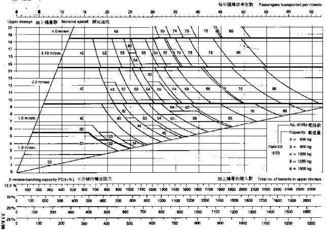 在这些图表中曲线内包含的为两个阿拉伯数字,第一个阿拉伯数字表示所需电梯数量,第二个阿拉伯数字表示这些电梯的载重量(参见图上的解释),额定速度在图的左边线上表示。