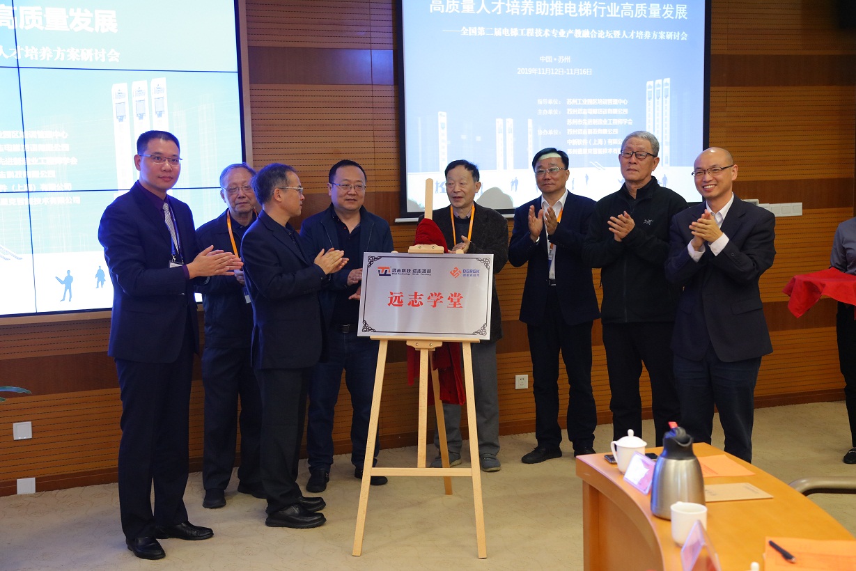 开幕式伊始,在常熟理工学院教授卢达,深圳汇川技术股份有限公司副总裁邵海波,苏州大学博导、教授芮延年,江苏省特种设备安全监督检验研究院原副总工程师原徐成共同见证下,苏州市市场监督管理局党组成员、副局长邢东生,苏州工业园区培训管理中心主任陆万良,电梯行业资深专家、原《中国电梯》杂志社主任李增健,苏州远志科技有限公司、苏州远志电梯培训有限公司创始人顾德仁共同为“远志学堂”揭牌。