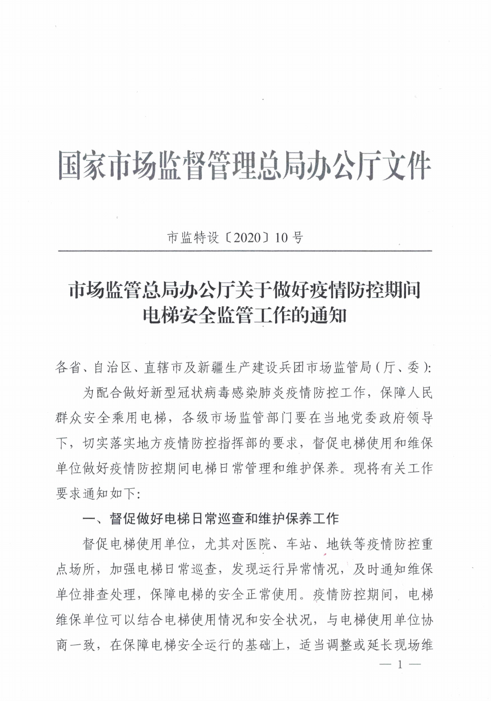 关于做好疫情防控期间电梯安全监管工作的通知